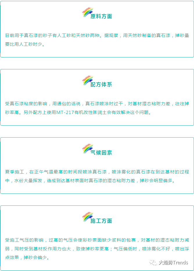 有的真石漆在噴涂時掉砂較多,嚴重時可達1/3左右,造成成本的嚴重浪費,也就間接的提高了材料成本。