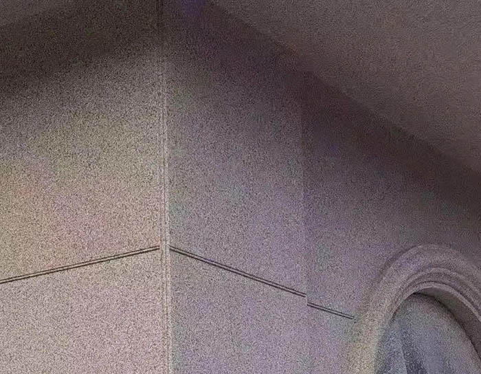 為了讓多彩涂料噴涂效果更接近石材,原則上可采用與石材一樣的分格,比如陰陽角分格、窗口分格、樓沿分格。但考慮到石材的局限性,水包砂分格可以不用在陰陽角部位進(jìn)行分格,建議可在窗口側(cè)面必須進(jìn)行分格,并注意盡量不要出現(xiàn)小塊、小邊的現(xiàn)象。